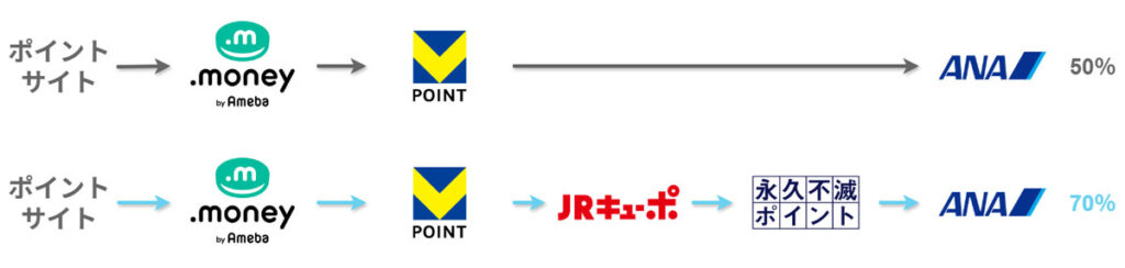 2. JRキューポを「永久不滅ポイント」経由でANAマイルへ という仕組み。手順はやや多いものの、最終的に70%の高レートでANAマイルに変換できるのです。